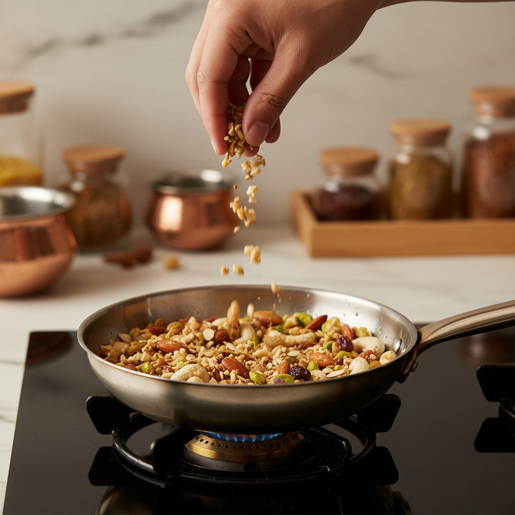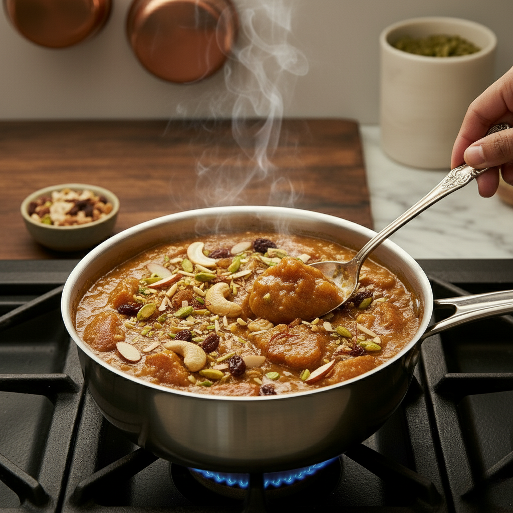 - Roast the Dry Fruits: In a separate pan, heat 2 teaspoons of ghee over low heat. Add the chopped nuts and roast until they turn a light golden brown. Remove and set aside. In the same ghee, quickly fry the raisins until they plump up. Remove and set aside with the nuts.