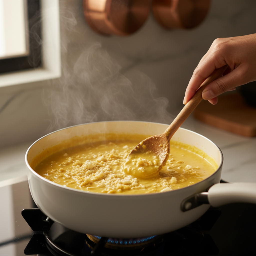 - Reduce the flame to low and whisk continuously until the khoya is completely dissolved into the milk, preventing it from sticking to the bottom.