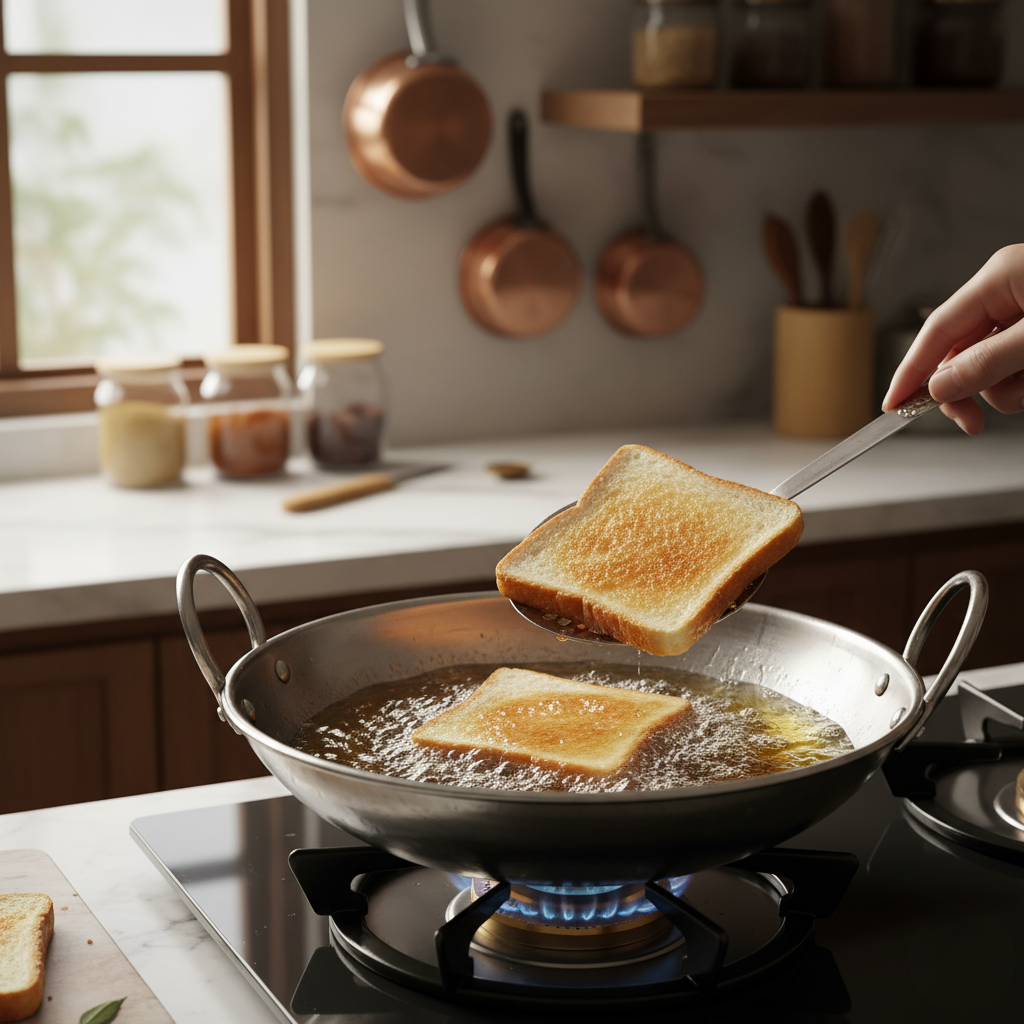 - Once the oil is medium-hot, carefully add the halved bread slices in batches.