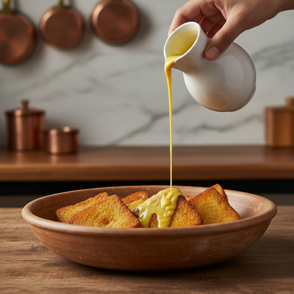 - Immediately place the fried bread pieces in a wide dish and pour the prepared warm milk mixture over them, ensuring all pieces are well-coated.