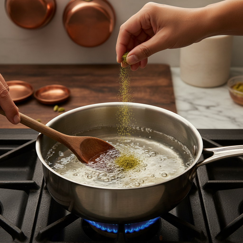 - Once the sugar dissolves, add the cardamom powder and stir. You do not need to achieve a one-string consistency.