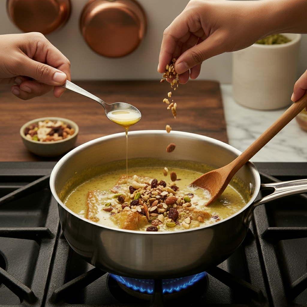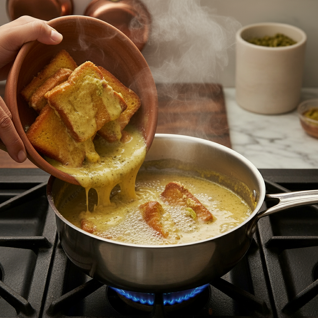 - Combine Everything: Gently add the milk-soaked bread pieces to the sugar syrup.