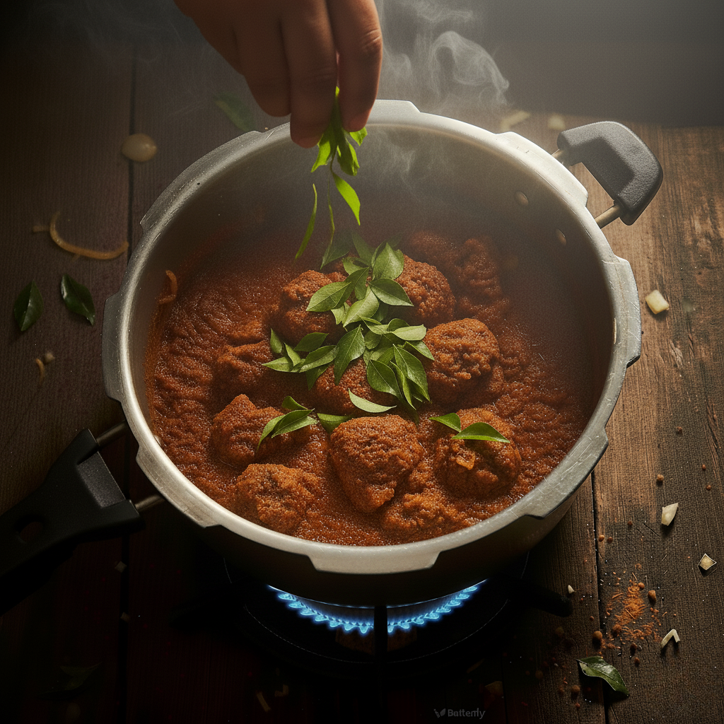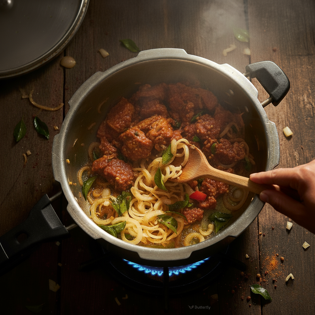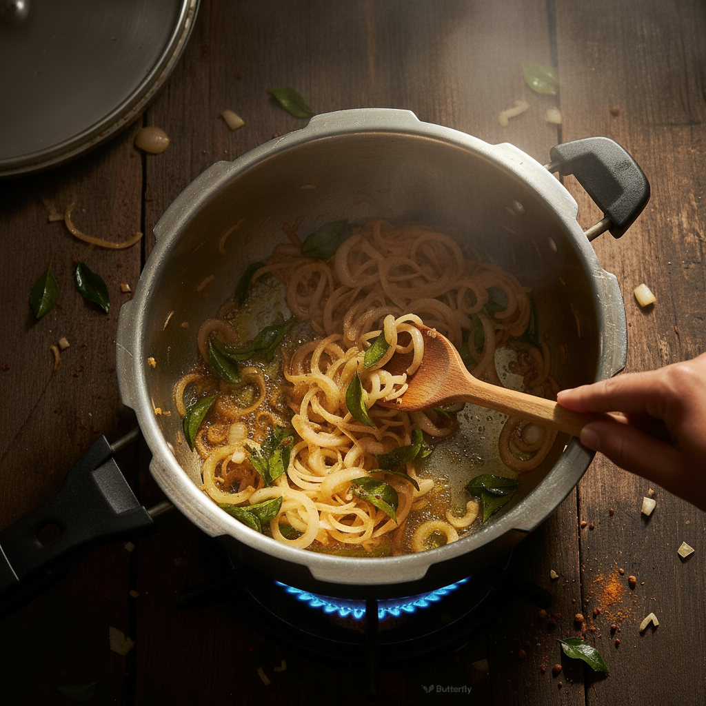 Heat oil in a pressure cooker. Add sliced onions and curry leaves, sautéing until the onions turn golden brown and fragrant.