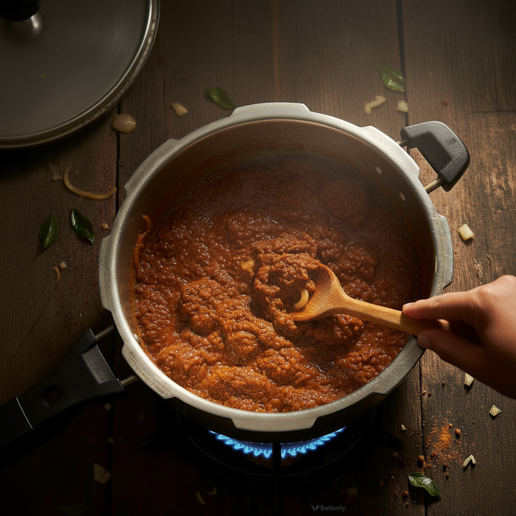 Once the pressure releases naturally, open the cooker and cook on high heat to reduce the liquid. Stir continuously until you achieve a thick, coating consistency masala.