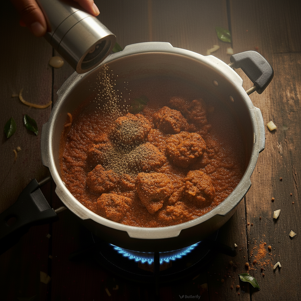 Mutton Pepper Masala is a bold, spicy dish where boneless mutton is marinated in a ginger-garlic-chili paste and aromatic spices, then pressure-cooked to perfection. The magic lies in the reduction process that creates a thick, intense masala coating the tender mutton pieces. Finished with a generous sprinkle of fresh pepper, this dry-style curry offers a powerful flavor punch that pairs wonderfully with simple rice or chapati.
