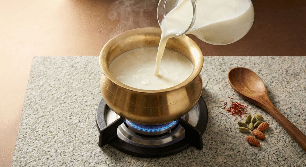Begin by pouring milk into a deep, heavy-bottomed pot. Place it over medium heat and bring it to a gentle boil, stirring occasionally to prevent scorching at the bottom.