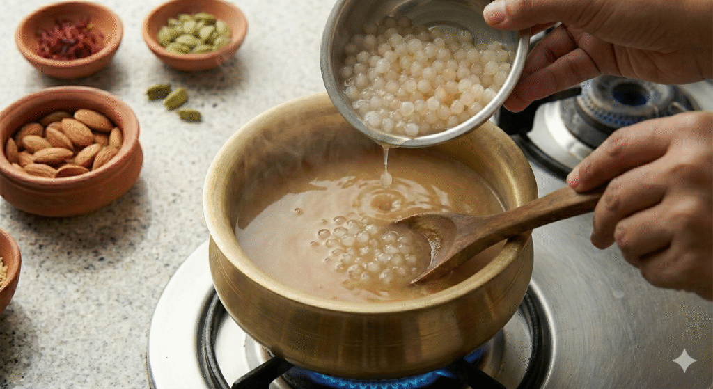 Maintain the kheer on a low flame, allowing all ingredients to meld together beautifully. Avoid vigorous boiling to preserve the delicate texture of the sago and prevent the milk from becoming too thick too quickly.