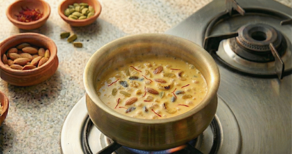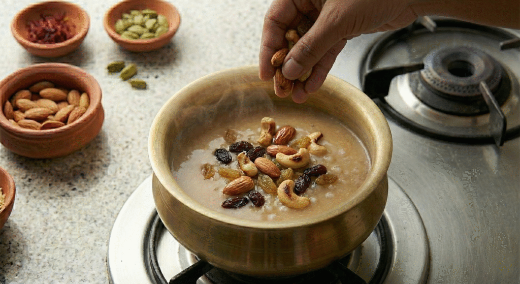 Introduce the roasted nuts and plump raisins to the kheer. These elements add wonderful texture contrasts and bursts of flavor throughout the pudding.